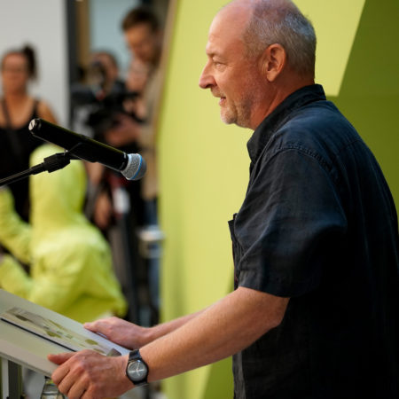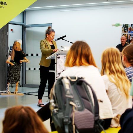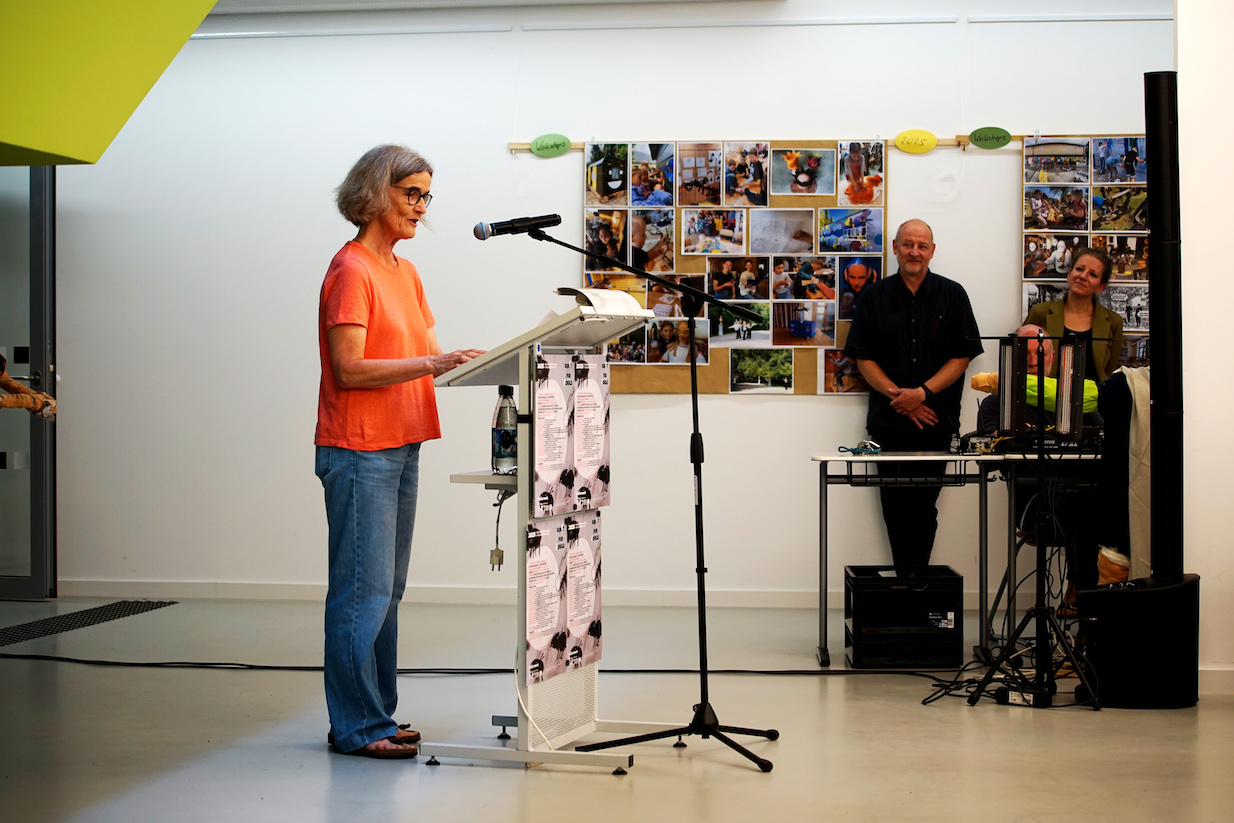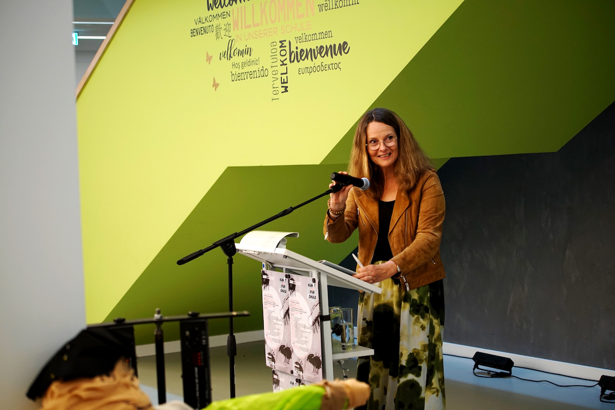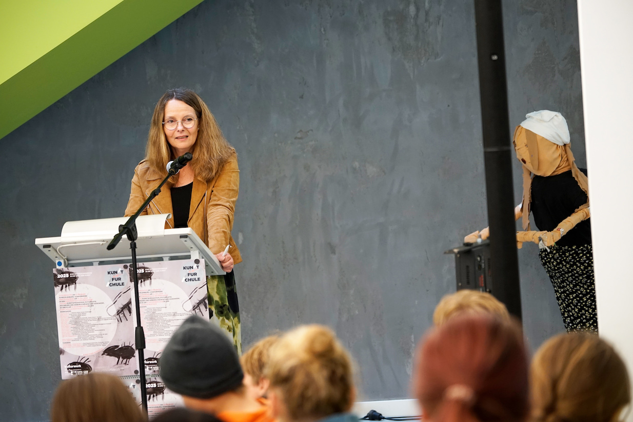 Nach der Begrüssung durch die Schulleiterin der Europaschule Rövershagen Ulrike Kleist, folgten Grussworte der Ministerin Bettina Martin, der Schirmherrin des Projekts sowie Robert Günther vom Vorstand des BBK-MV und Tanja Zimmermann, der Projektleiterin der Abschlussveranstaltung kunst für schule 2025