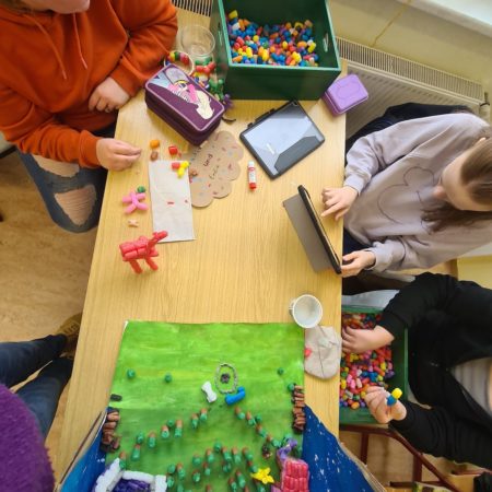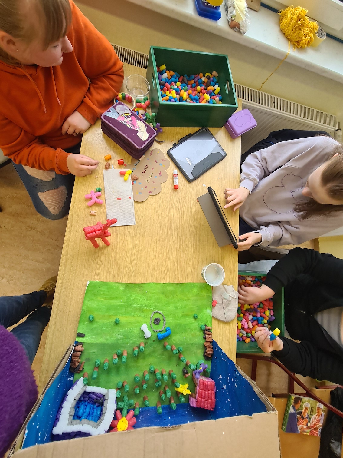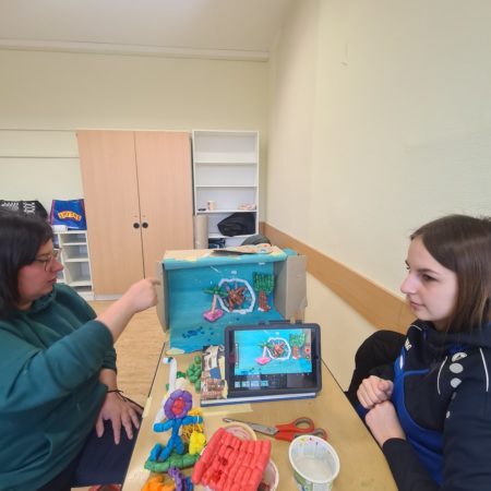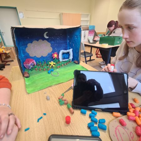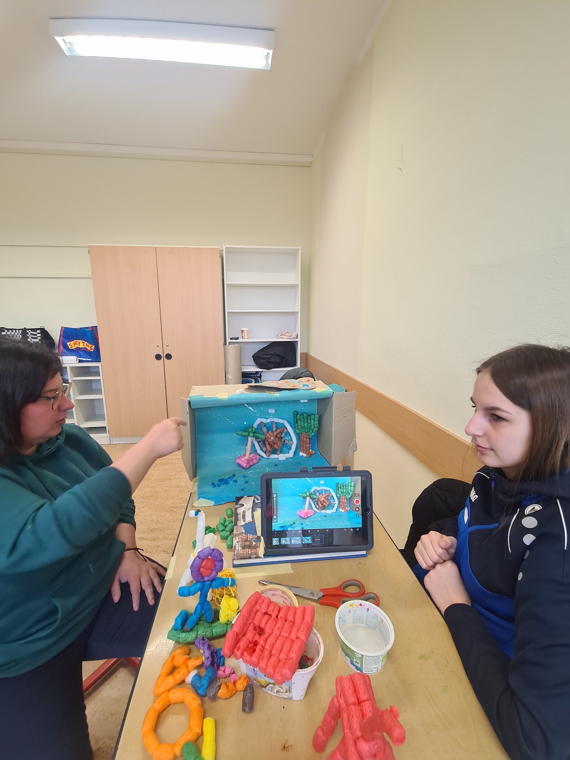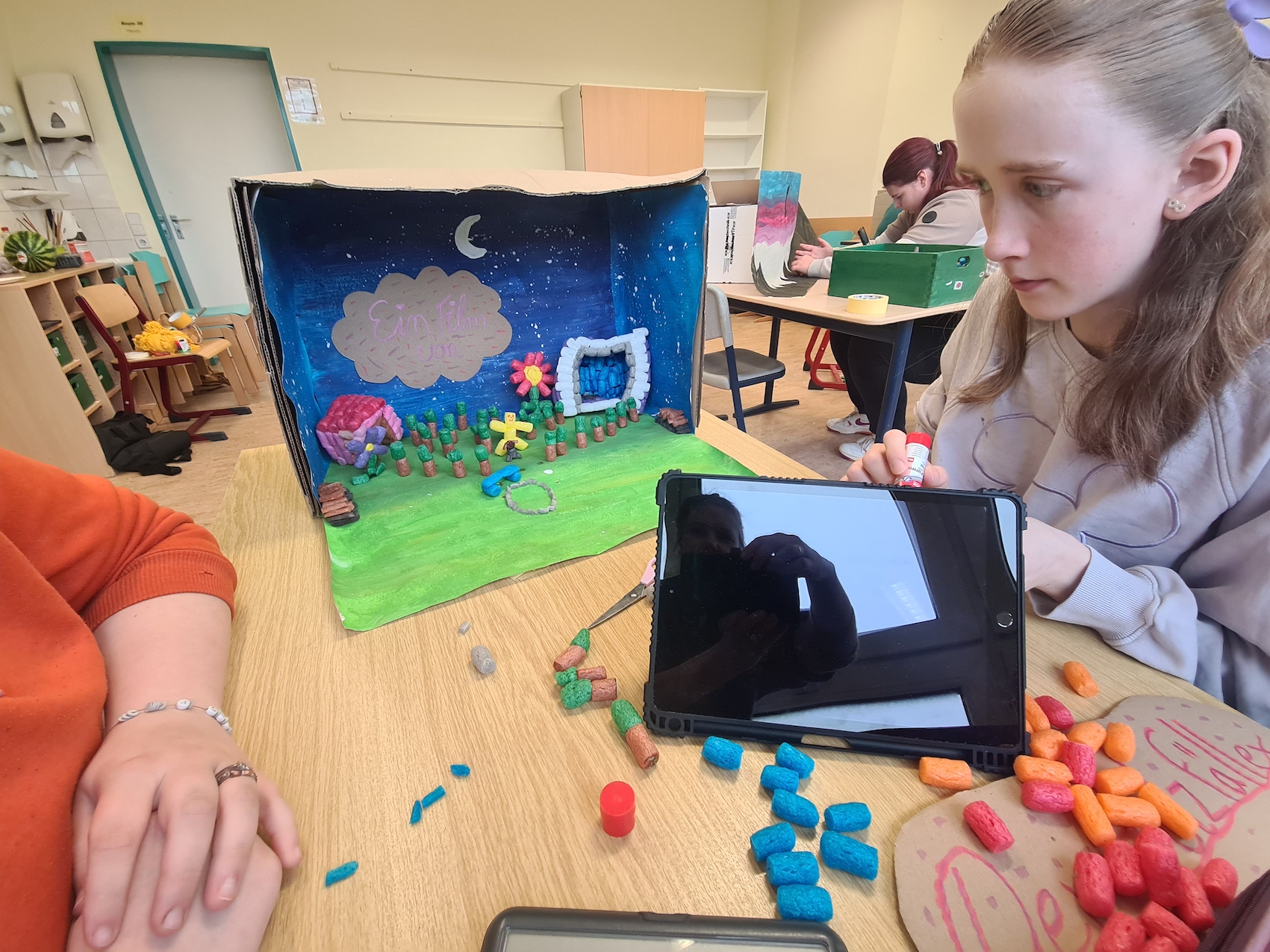 In dem Workshop loteten Schüler:innen verschiedene Möglichkeiten der künstlerischen Praxis bis zum Stop-Motion-Filmzum Thema Verwandlung durch Einfluss des Anderen aus. Wir arbeiteten ergebnisoffen: Malen, Filmen, Gestalten mit Ton und Puffermaterial. In Gruppenarbeit wurden Träume und Beziehungen auf die Probe gestellt, im oszillierenden gestalterischen Prozess ausgefochten.