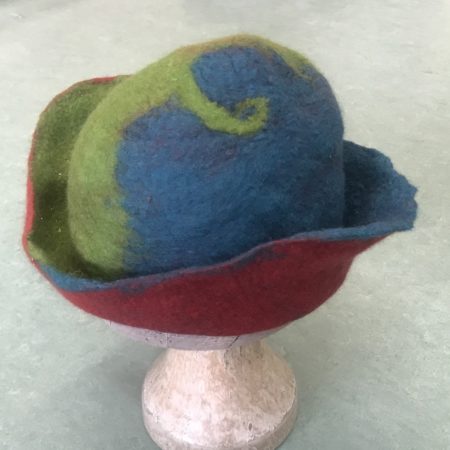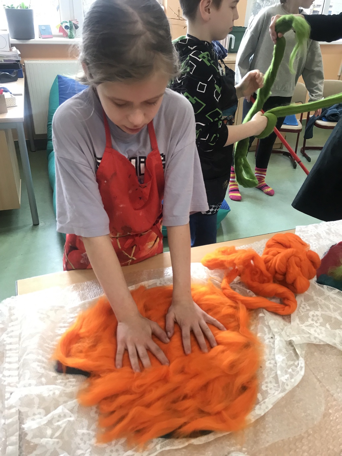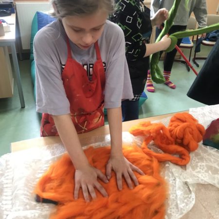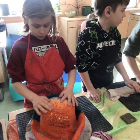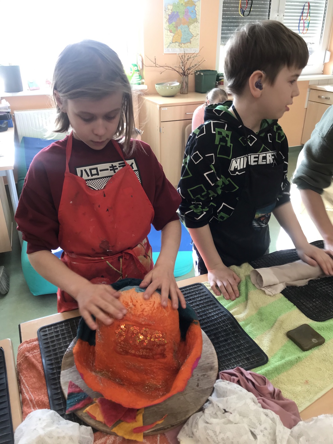 Nach einer Einführung in die Geschichte des Hutes entschieden sich die Schüler:innen für ihre Entwürfe gezeichnet. Mit Sorgfalt und Phantasie wurde Wollfilz gelegt, mit Seifenwasser besprenkelt, vorsichtig gerieben, gedreht, wieder belegt und am Ende kräftig gewalkt, was den Schüler:innen einiges abverlangte. Beim Ziehen über die Hutmacherform wurde der Hutkörper dann sichtbar und schließlich beim Anpassen auf dem eigenen Kopf. Spülen-schleudern-trocknen-fertig! Höhepunkt war die Modenschau mit historischen Hüten und den eigenen Hutkreationen vor der gesamten Schule – mit „Laufsteg“, cooler Musik und mutiger Rede von Julius. Stolz präsentierten die Kinder ihre Unikate, die sie gleich auf der Klassenfahrt aufsetzen konnten. „Das hat Spaß gemacht – danke!“ So das spontane Feedback eines Schülers.