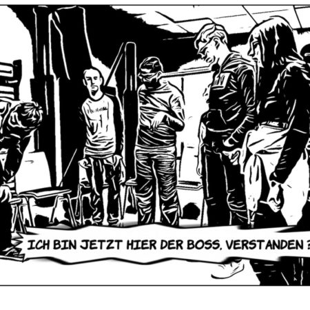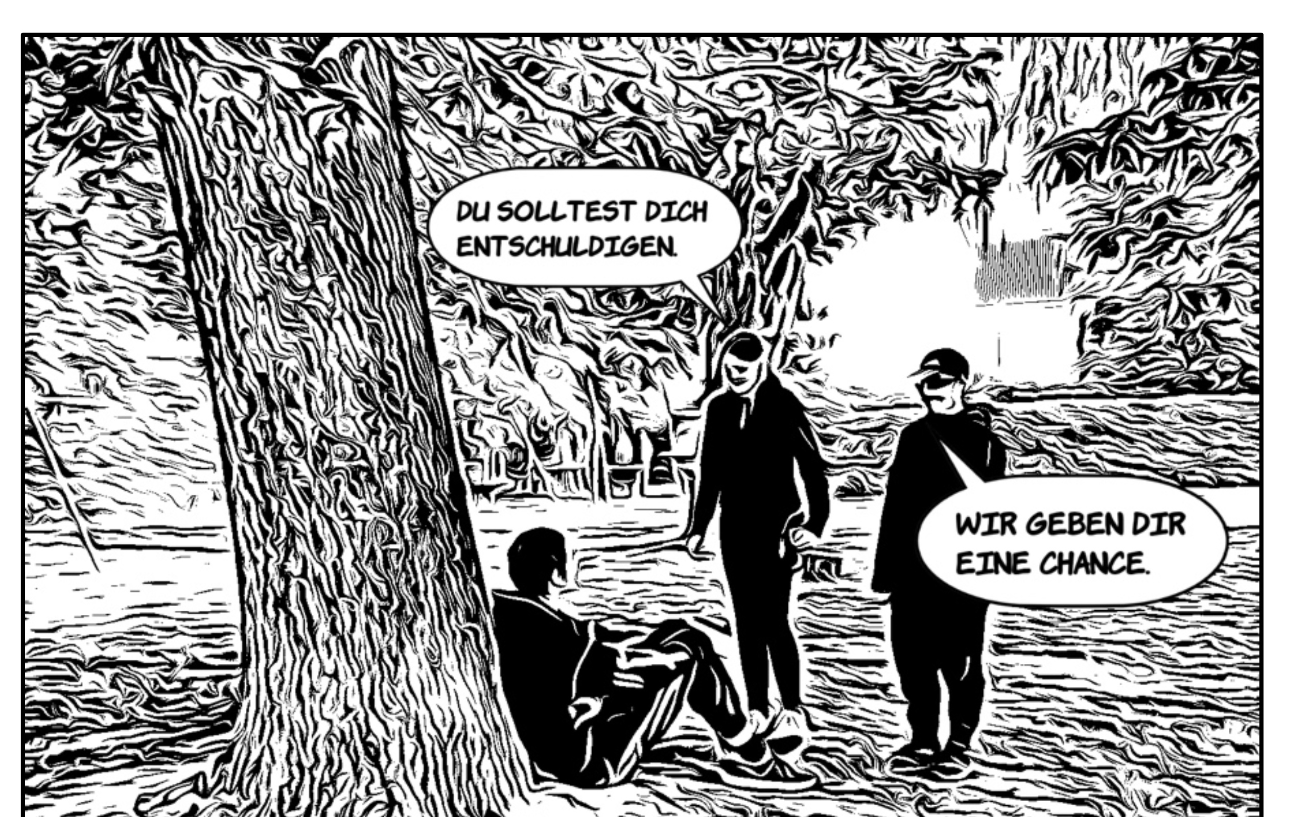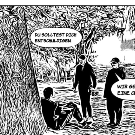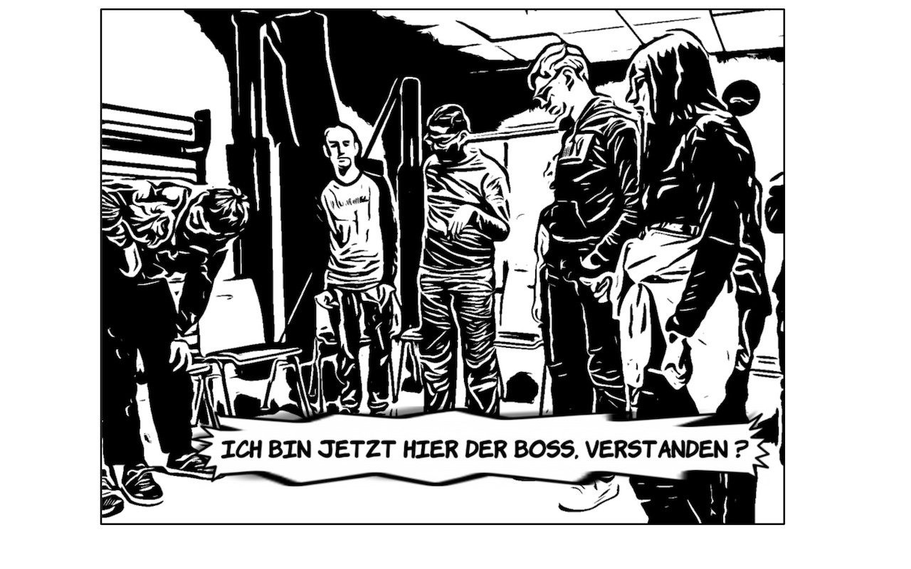 An dramaturgisch wichtigen Stellen der Handlung wurden Fotos von der Gruppe und den einzelnen Schüler:innen gemacht. Diese Fotos wurden dann von den Teilnehmer:innen besprochen, ausgewählt, bearbeitet und in Comic-Zeichnungen umgewandelt. Am Ende der sehr inspirierenden Arbeit entstand eine 20-seitige Comic-Broschüre und eine Power-Point-Präsentation einer tollen Gruppe.