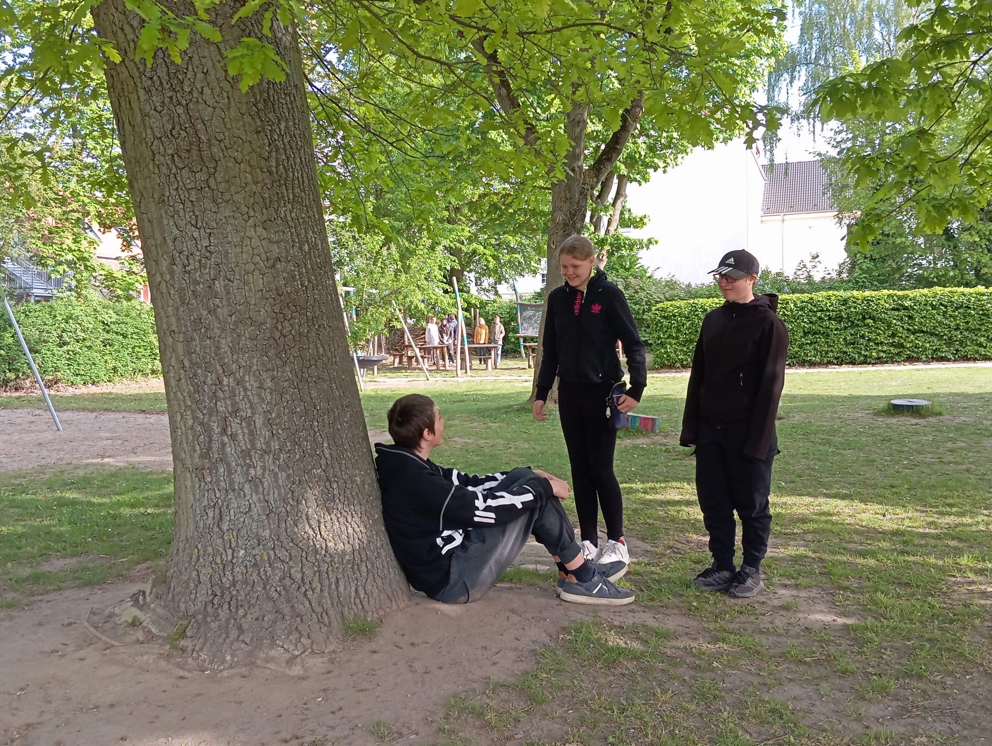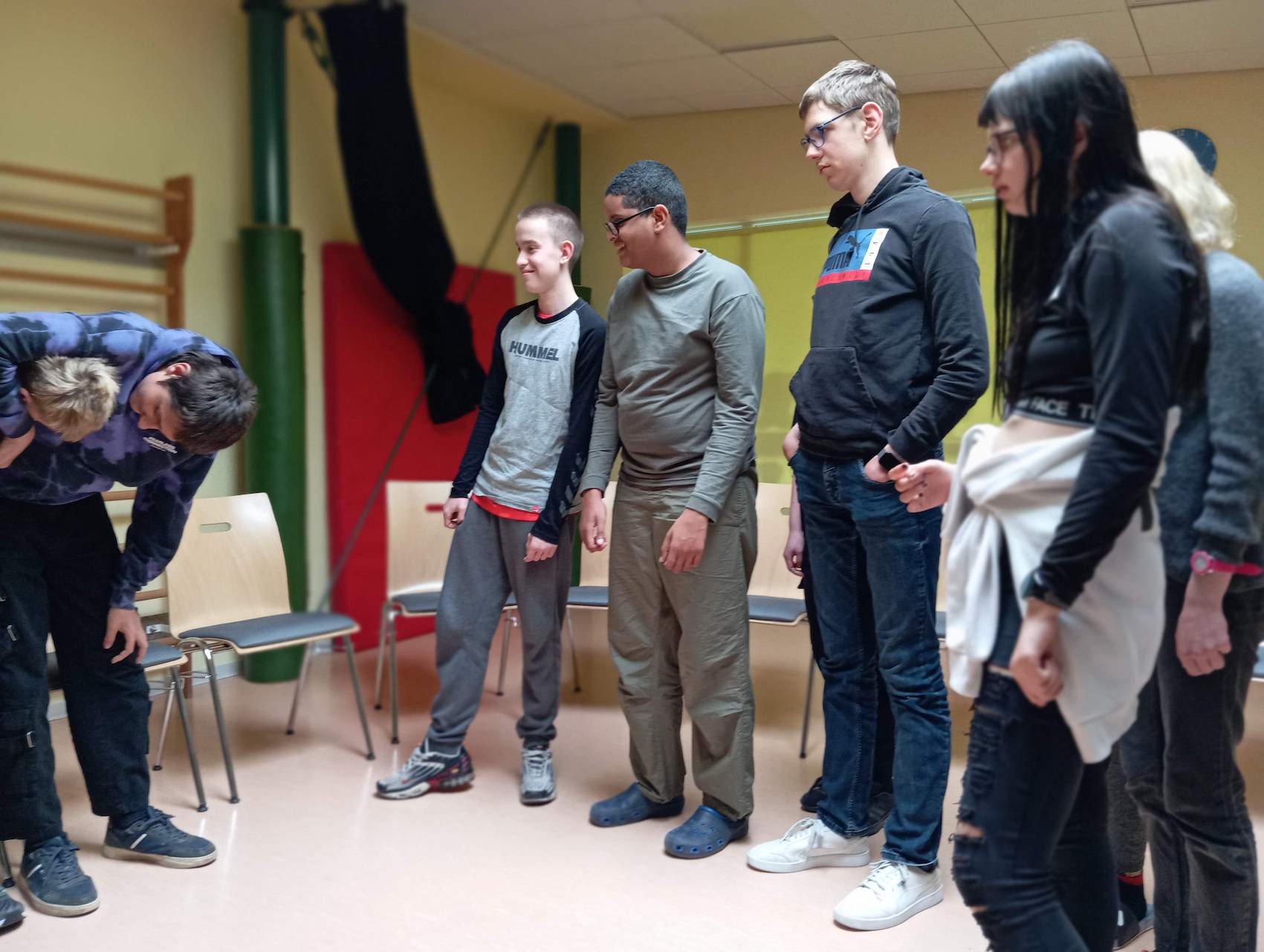 Die schauspielerischen Vorgänge zu den Handlungsabläufen in der Geschichte entwickelten die Schülerinnen und Schüler durch szenische Improvisationen. Die drei begleitenden Pädagog:innen haben den Workshop spielerisch unterstützt.